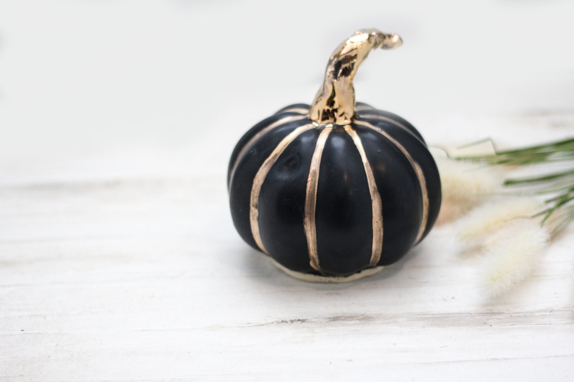 This is a decorative ceramic pumpkin with a striking, modern design. The pumpkin has a sleek matte black finish, accented with vertical metallic gold stripes running from top to bottom, giving it an elegant and refined look. The stem is also coated in a shiny gold, adding a touch of sophistication and making it stand out as a chic fall decoration. Perfect for adding a stylish, contemporary touch to seasonal decor.