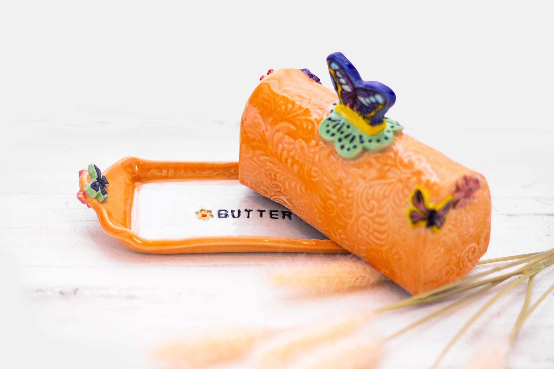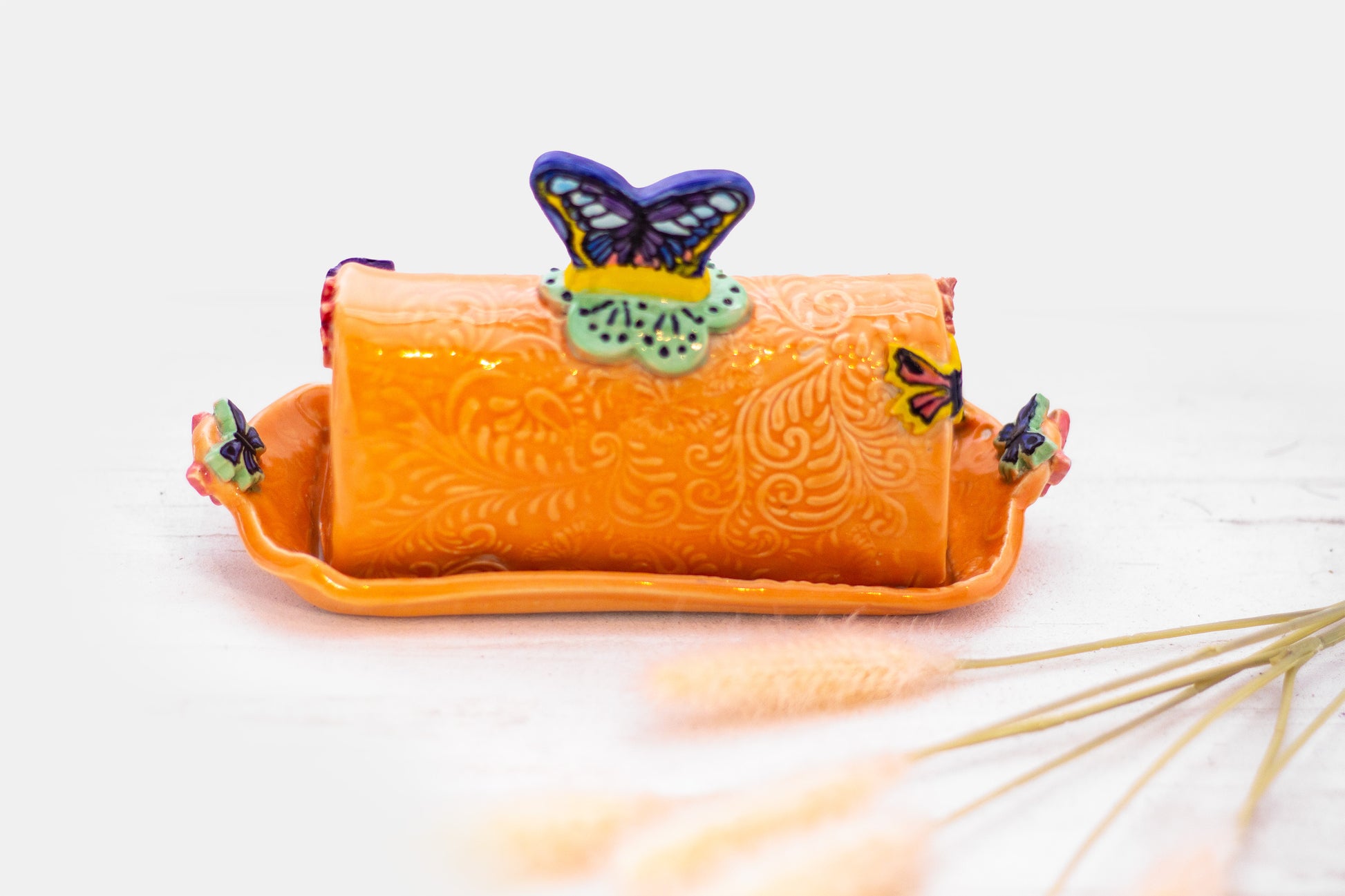 Add a pop of color and charm to your table with the Fluttering Delight Butter Dish! This vibrant orange butter dish features intricate, swirling patterns and delightful butterfly accents, making it a whimsical addition to any kitchen. Perfect for those who love unique, nature-inspired designs, this dish brings a joyful touch to your daily dining experience.