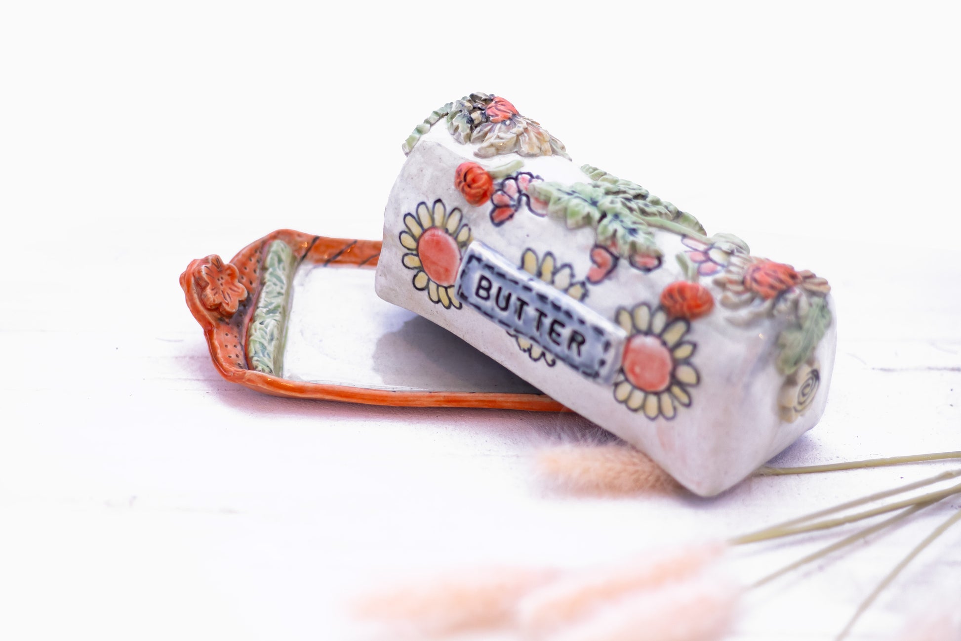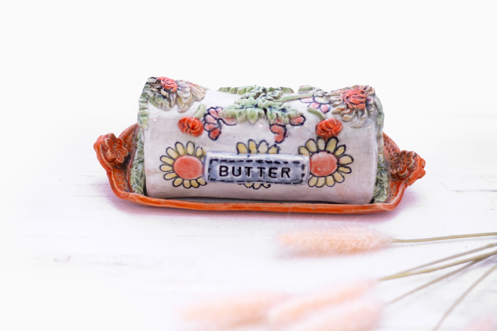 Brighten up your table with the "Garden Blooms Butter Dish," adorned with hand-sculpted flowers in vivid hues and a charming orange base. This unique, floral-inspired design captures the essence of a lush garden, adding a splash of nature’s beauty to your dining experience. Perfect for adding a cheerful, artistic touch to your table setting, it brings warmth and character to every meal. A delightful way to keep butter fresh and stylish!