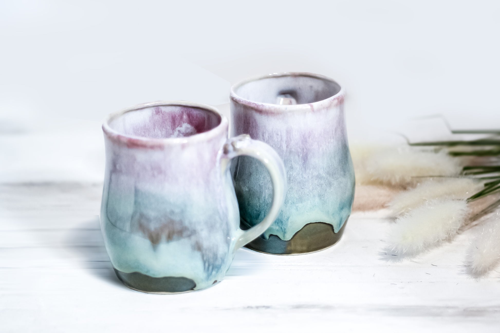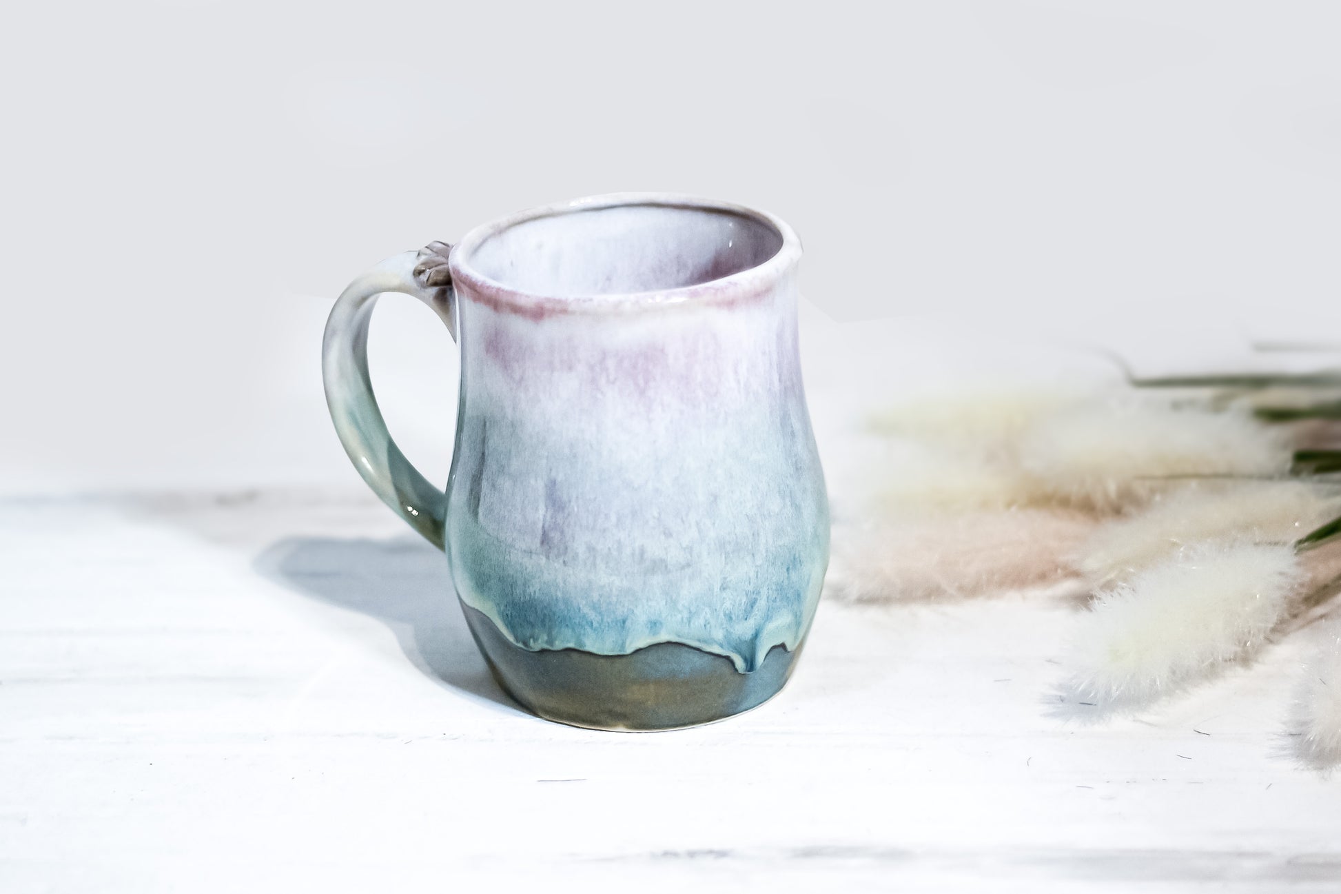The Lavender Horizon Mug captures the serene beauty of dawn breaking over rolling landscapes. This handbuilt ceramic mug features a soothing gradient of pastel hues, blending soft purples, greens, and blues that mimic the gentle transition from night to day. Each piece is uniquely glazed to ensure no two mugs are the same, adding an element of individuality to your morning ritual. The comfortable handle and generous size make it perfect for savoring a warm cup of tea or coffee. Embrace the calmness of a new day with this artistic and tranquil mug.