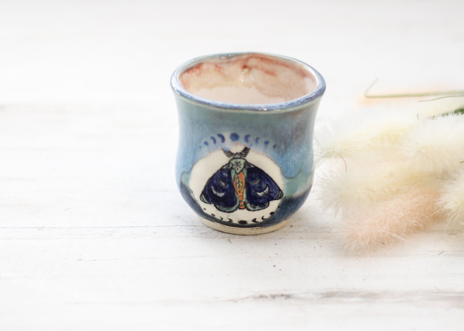 The Luna Moth Espresso Cup is a charming blend of artistry and nature, featuring a hand-painted moth surrounded by crescent moons and a soft gradient of blue and green hues. This unique design evokes a sense of mystery and whimsy, making it the perfect vessel for a magical espresso experience.