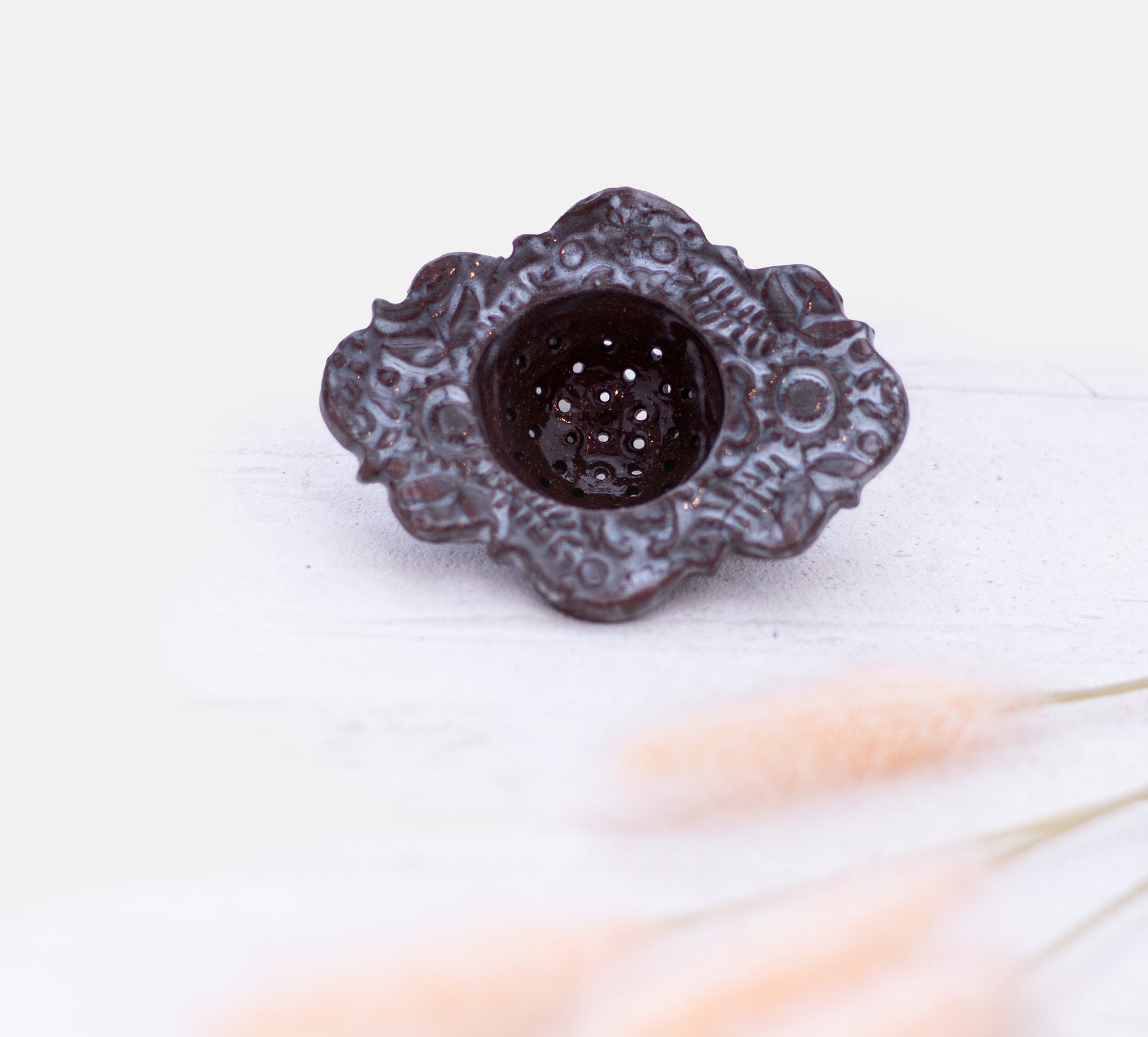 The Midnight Garden Tea Strainer is a strikingly elegant ceramic piece that brings a touch of mystery and sophistication to your tea ritual. Featuring a deep, glossy black glaze with subtle texture, this tea strainer is adorned with intricate, embossed floral and vine patterns, reminiscent of a hidden garden bathed in moonlight.