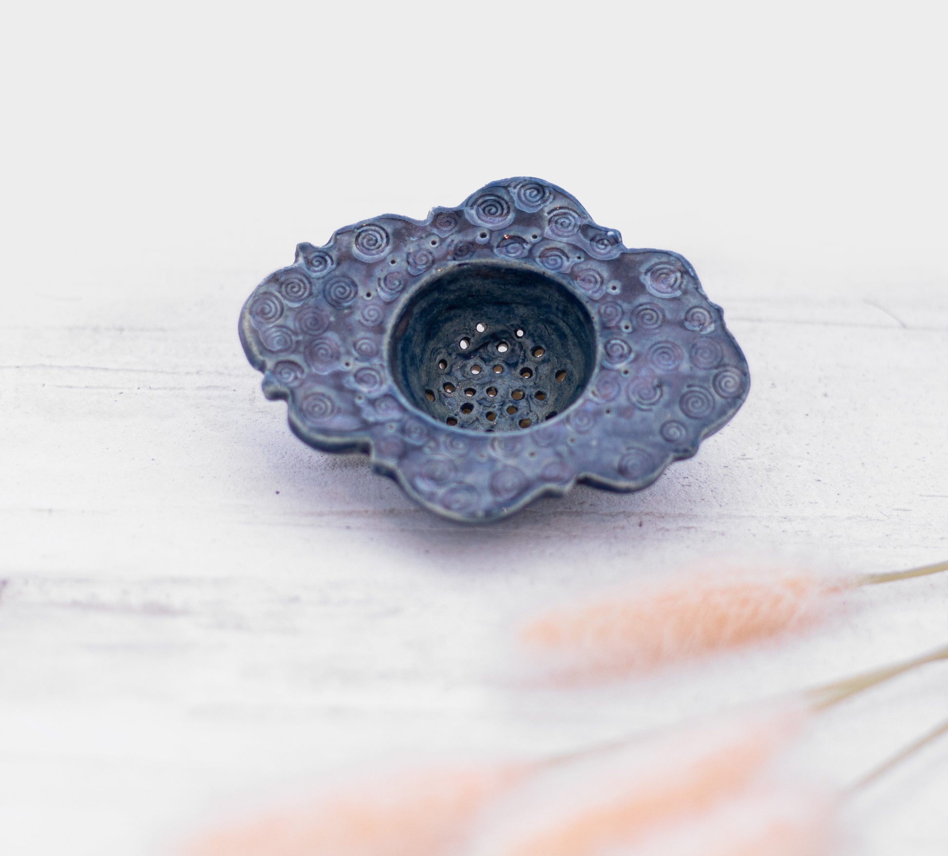 The Midnight Swirl Tea Strainer is an elegant and intricately crafted ceramic piece that adds a touch of mystery and beauty to your tea ritual. This tea strainer features a deep, rich indigo glaze with a subtle sheen, creating a calming, celestial appearance. The surface is adorned with embossed spiral patterns that evoke the movement of swirling galaxies or flowing water, giving the piece a dynamic yet tranquil feel.