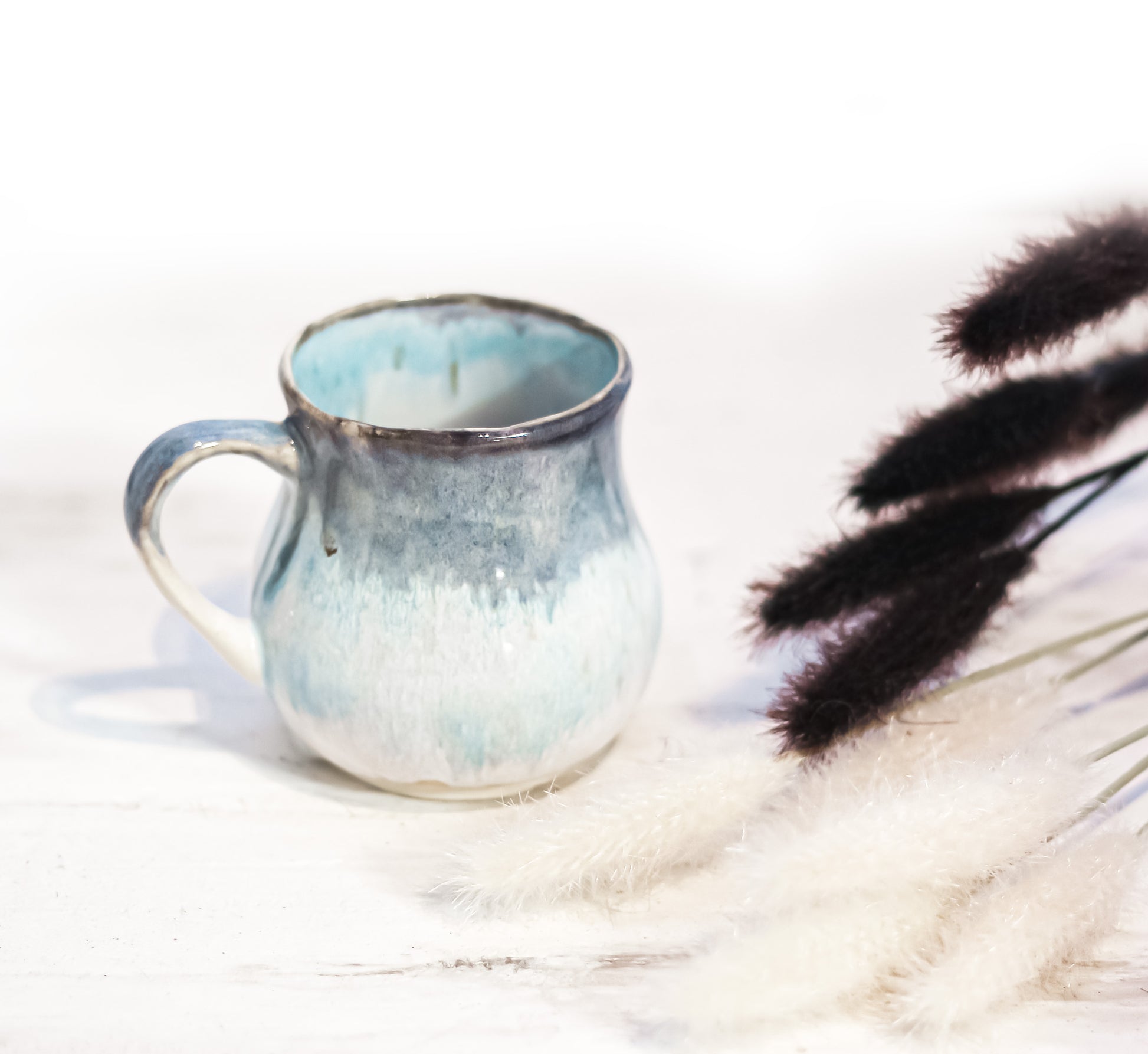 This Merva mug has a calming, serene aesthetic with a soft blue and white gradient glaze. The colors transition smoothly from a darker blue at the rim to a lighter, almost white hue towards the base, mimicking the appearance of a misty morning or calm ocean waves. The glaze has a slightly textured, organic feel, giving the mug a handcrafted look. The rounded, slightly flared shape adds to its cozy charm, making it perfect for warm beverages.