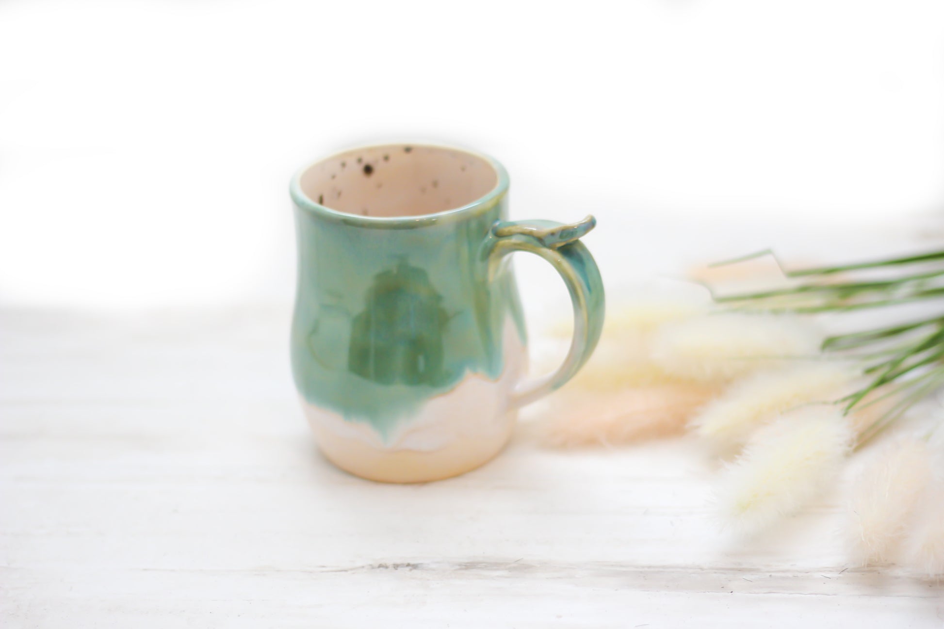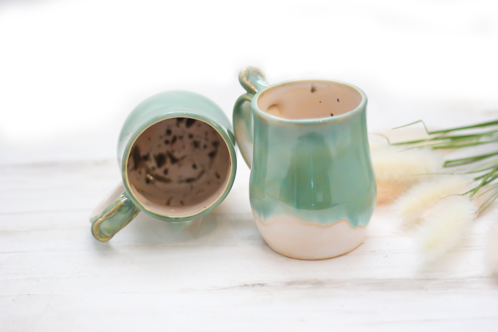 These mugs feature a smooth, semi-matte glaze with a subtle green hue on the exterior, creating a relaxing, oceanic feel. The interior reveals a speckled pattern, adding an element of rustic charm and a hint of surprise when sipping. The handle, designed with a graceful curve, offers a comfortable grip. Together, these mugs evoke a sense of tranquility and are perfect for a peaceful morning or evening reflection over your favorite warm beverage.