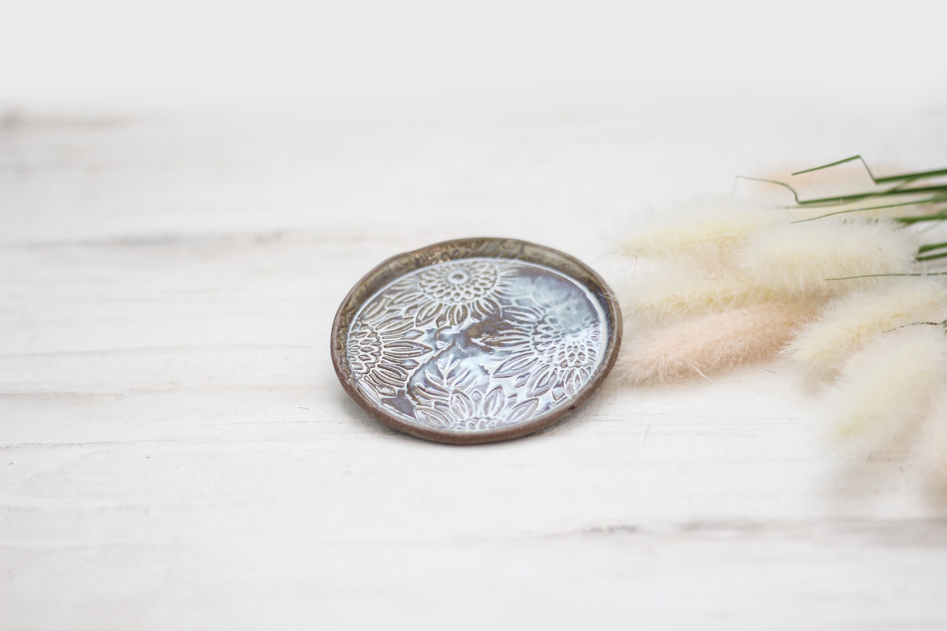 This delicate trinket dish captures the beauty of blooming sunflowers etched gracefully into its ceramic surface. Glazed in soft, earthy hues with a hint of iridescent sheen, it brings a touch of nature’s elegance to your space. Perfect for holding rings, small jewelry, or treasured keepsakes, this charming dish is both functional and decorative. Its petite size and intricate detailing make it an ideal accent piece for your dresser or bedside table, adding a warm, handcrafted touch to your home decor.