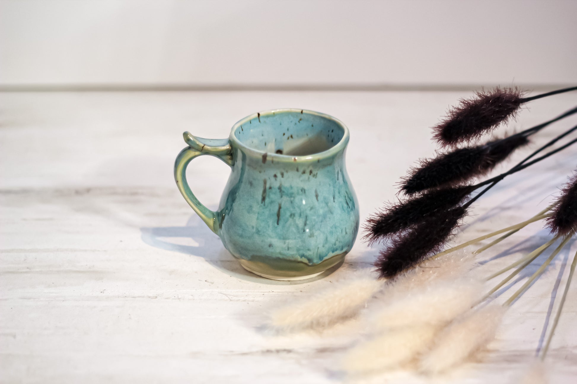 This is a handmade ceramic mug with a slightly rustic and artisanal appearance. It features a glazed finish in a light teal or turquoise color, with specks of darker color adding texture. The mug's shape is slightly bulbous, with a flared rim and a uniquely curled handle, giving it a handcrafted and organic feel. The base appears unglazed, adding to its natural aesthetic.