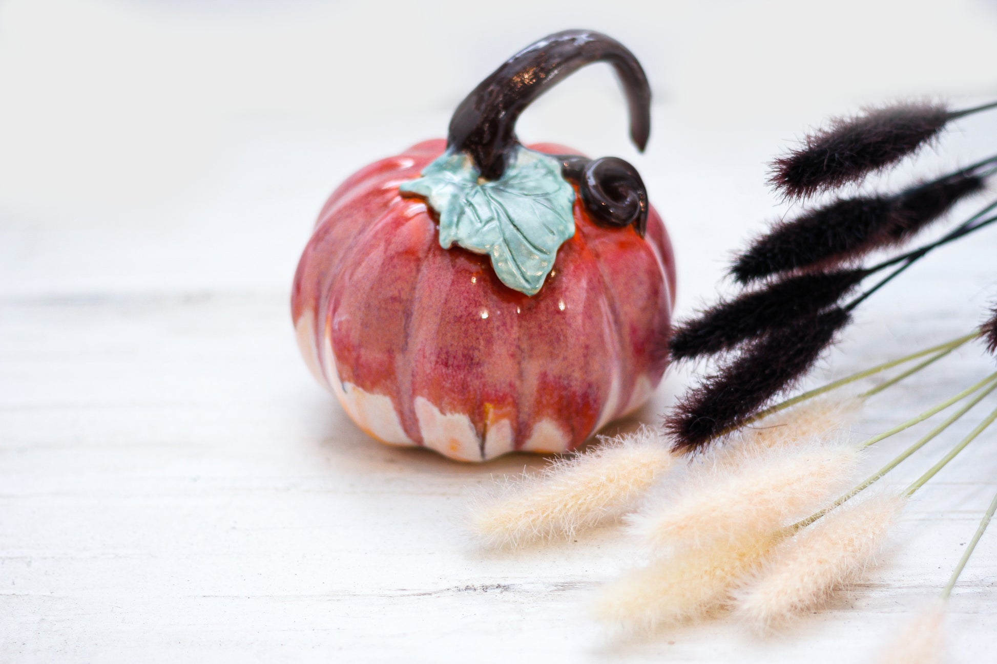 This ceramic pumpkin has a delightful and whimsical design, featuring a rich blend of red, orange, and white tones with a glossy finish. The stem is dark brown, with a curved and twisting shape, giving it an organic, lifelike appearance. A charming addition is the pale green leaf attached near the stem, adding a touch of contrast and detail to the piece. The swirling stem design and vibrant colors give this pumpkin a playful and decorative look, making it perfect for autumn and fall displays.